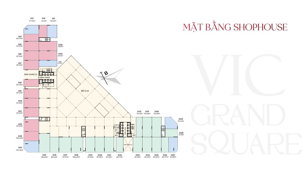 - Shophouse có 3 tầng (tầng 1, 2 và tầng 3) có diện tích mỗi tầng từ 61.6m2 – 115.3m2.